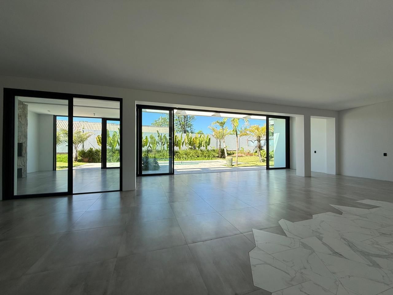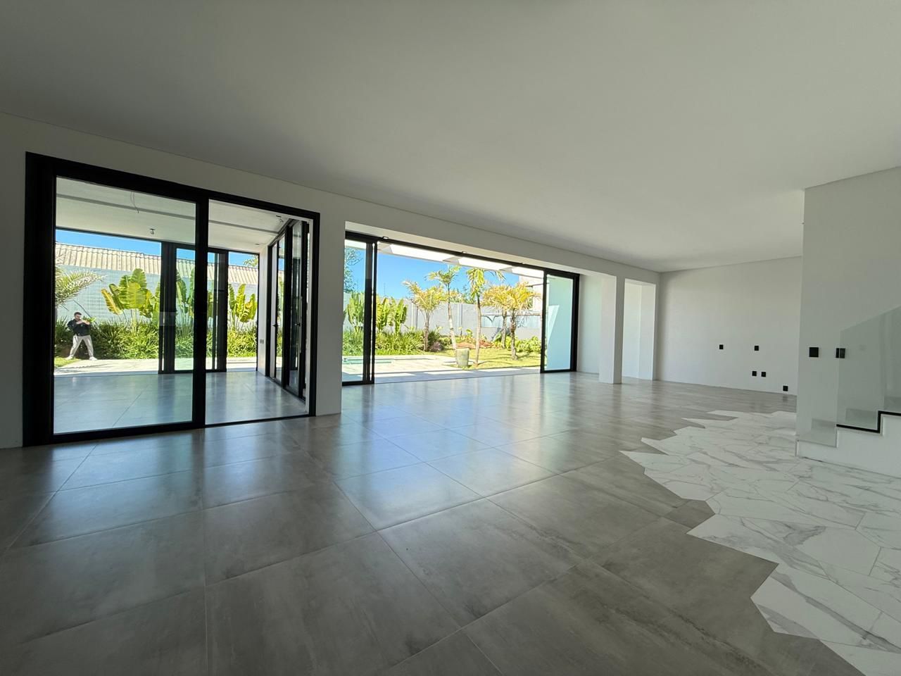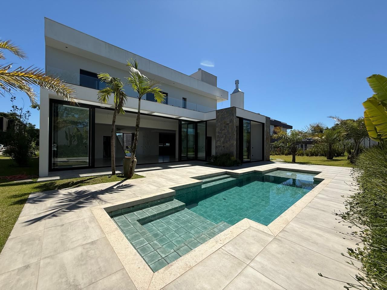 Composta por 5 suítes sendo uma master no pavimento superior, pavimento inferior temos um hall de entrada imponente, amplo living em 3 ambientes com pé direito duplo, lareira, cozinha americana, espaço gourmet com churrasqueira, área de serviço, lavabo, brinquedoteca , bicicletário, despensa, e garagem lado a lado para 3 veículos. Casa tem 410m² de área construída, ótimo padrão de acabamento, amplo pátio privativo com 1000m², e piscina de concreto!